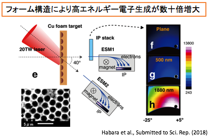 ナノからマイクロサイズの空孔を表面に持つ金属フォームターゲットにレーザーを照射すると、生成される高エネルギー電子のフラックスが30倍以上増加する結果が得られた。空孔サイズを変えた実験、及び詳細なシミュレーションにより、空孔内部でレーザーが反射・屈折することで空孔内部の波長程度の領域に集光し、高強度化する事により高エネルギー電子の生成効率が向上することが明らかとなった。これはいわば空孔がプラズマ集光鏡として働くことを示しており、集光鏡とターゲットが一体となることでアライメントの問題もなく、効率的に高エネルギー電子が得られる構造である。