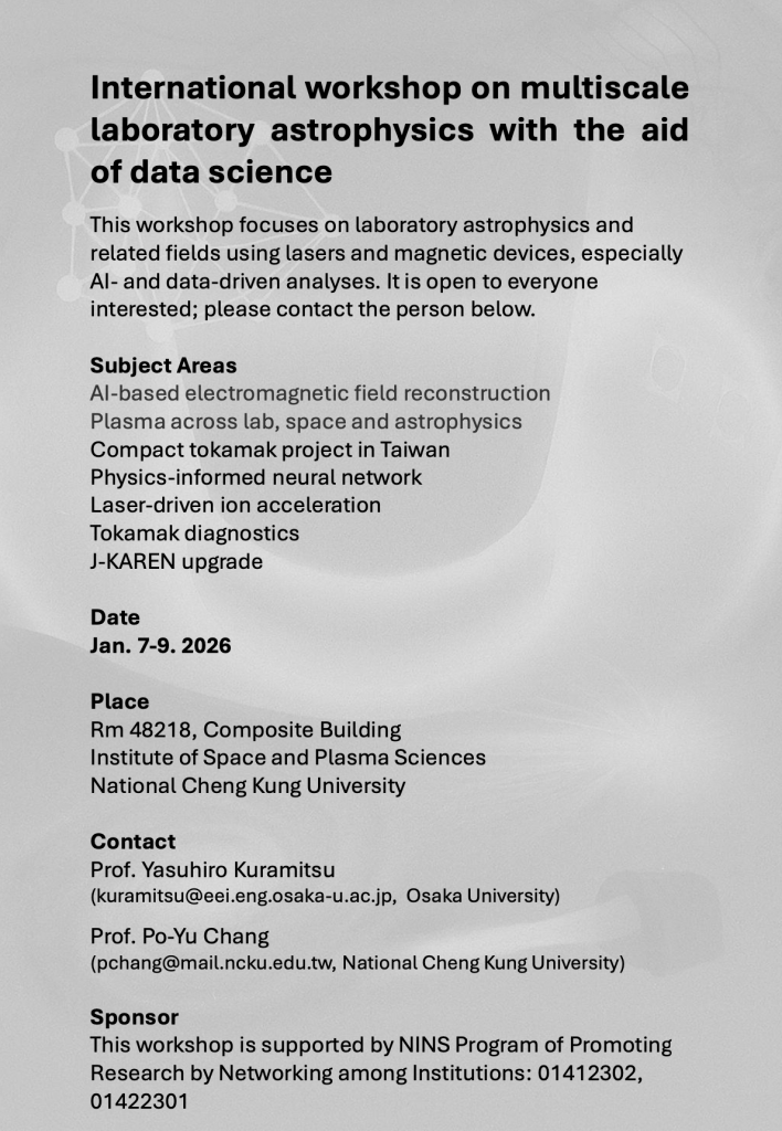 This workshop focuses on laboratory astrophysics and related fields using lasers and magnetic devices, especially AI- and data-driven analyses. It is open to everyone interested; please contact the person below.